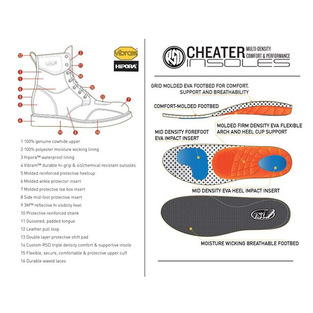 Двухкомпонентная подошва мотобот RSD Mojave разработана экспертами знаменитой итальянской компании Vibram, специализирующейся на производстве качественных резиновых подошв для любителей активного отдыха и спорта. Подошва Vibram Sole обеспечивает не только прочный контакт с подножками мотоцикла, устойчива к воздействию масел и химикатов, но и отличается долговечностью, прочностью и небольшим весом.